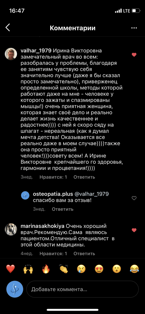 - Непрерывно повышает квалификацию на курсах остеопатии и кинезиологии: