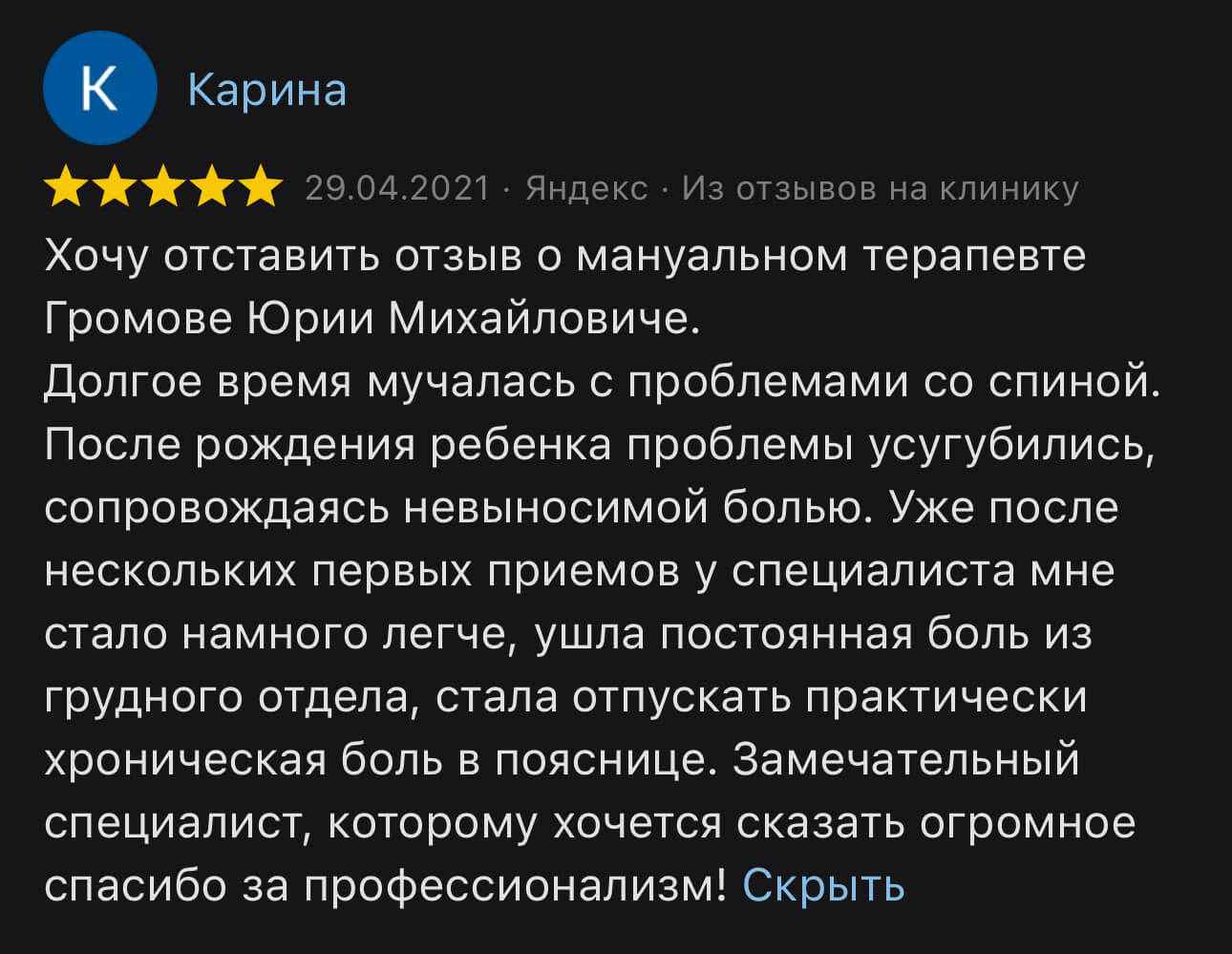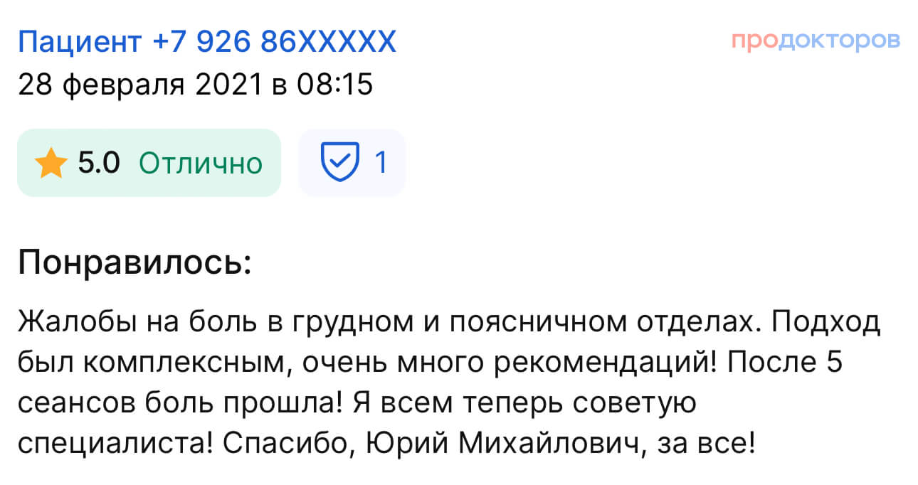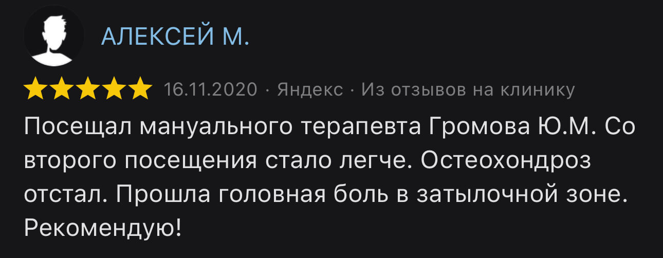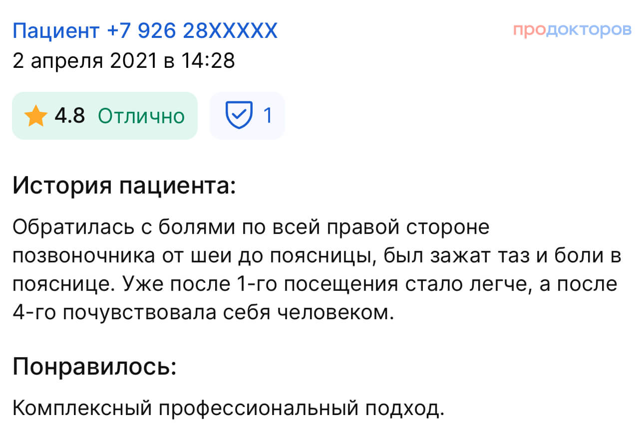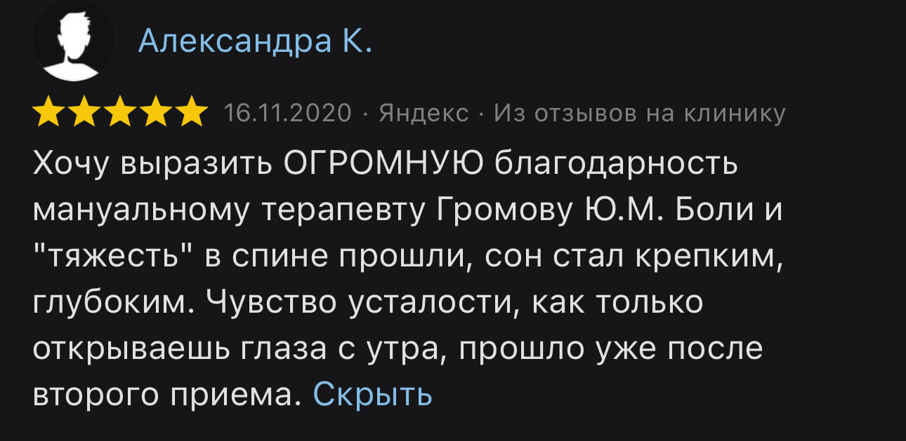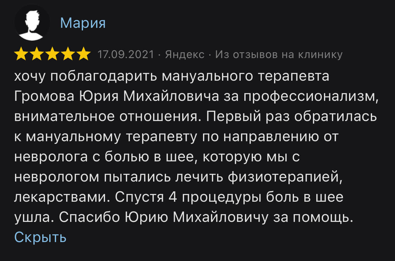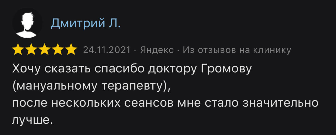 Один из распространённых мифов при положительной оценке сеанса звучит примерно так: «Он меня так закрутил, так всё хрустело, теперь точно всё на место встало». В реальности, болевые ощущения и даже мысленное ожидание болевых ощущений приводят к мышечному напряжению, а это мешает восстановлению правильного положения позвонков. Основным инструментом доктора в нашем центре являются умелые руки, да чуткие пальцы, воздействие которых должно быть мгновенным и точным.