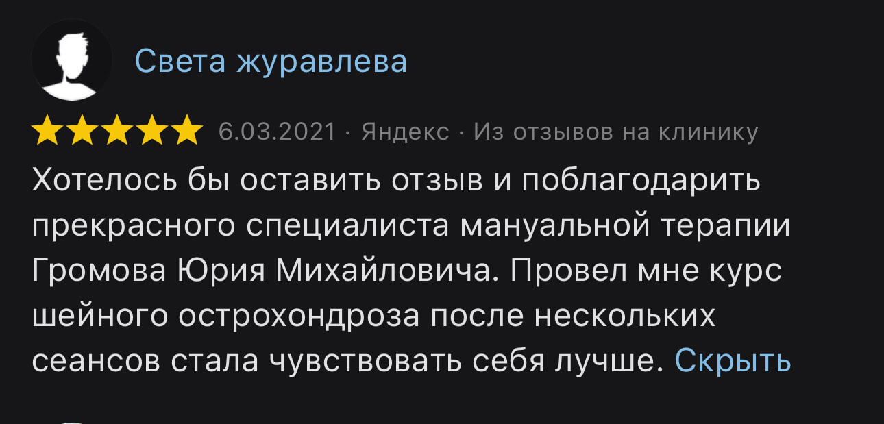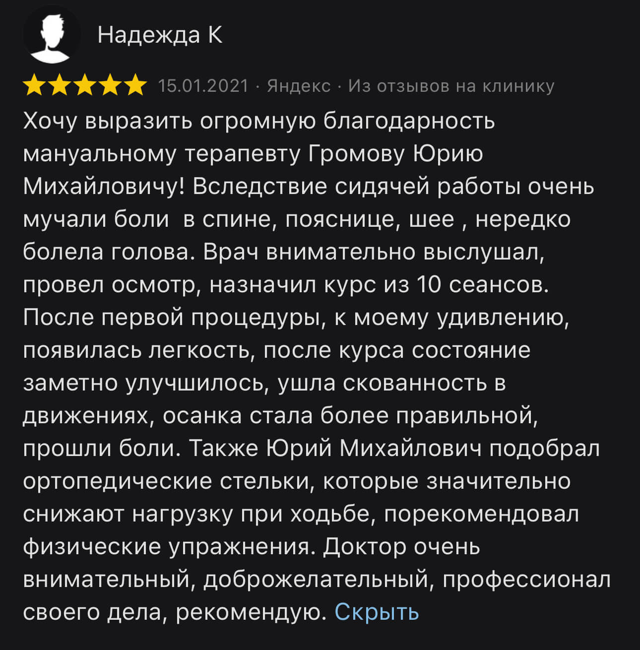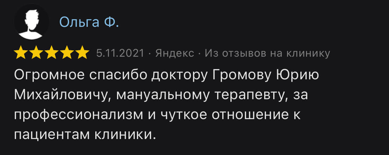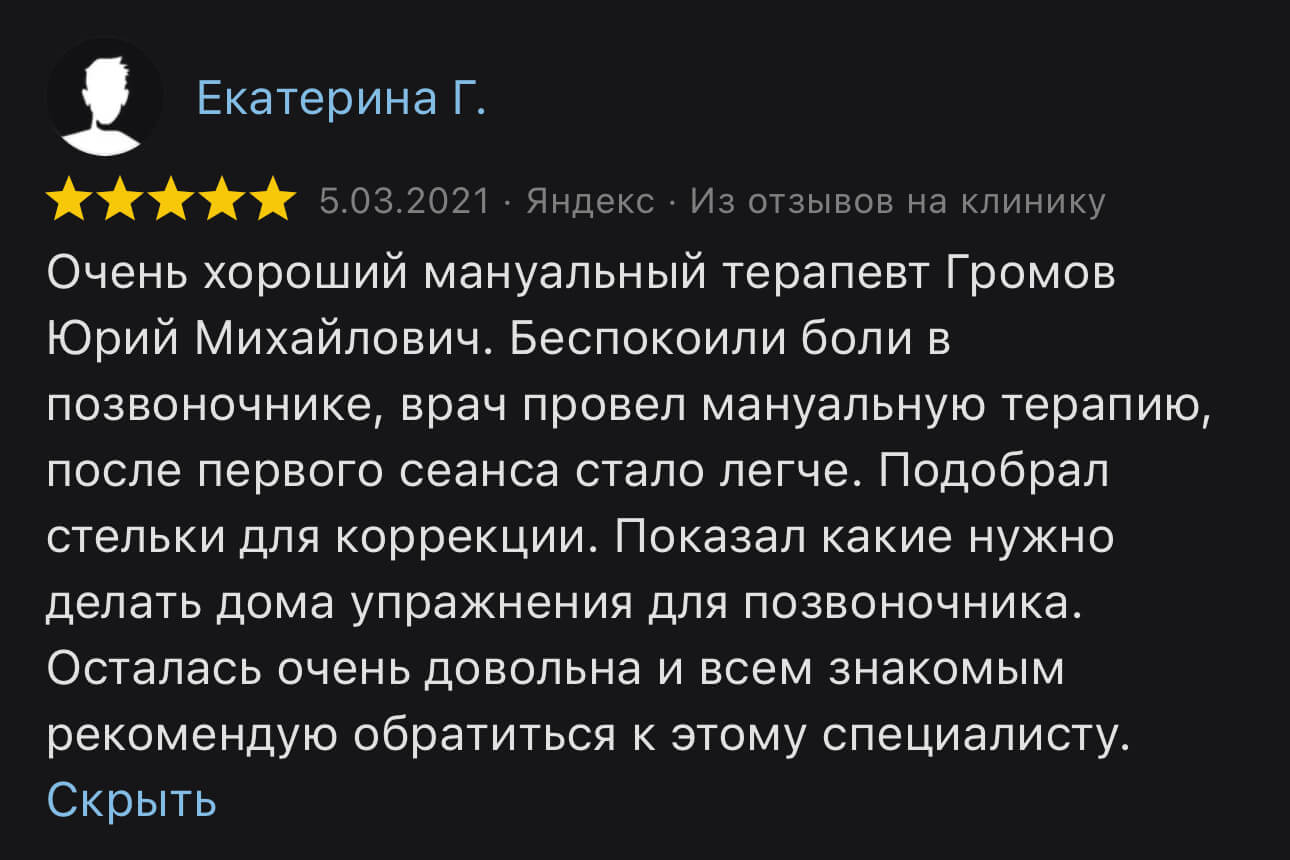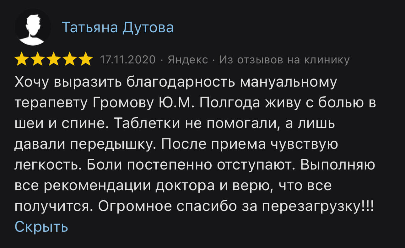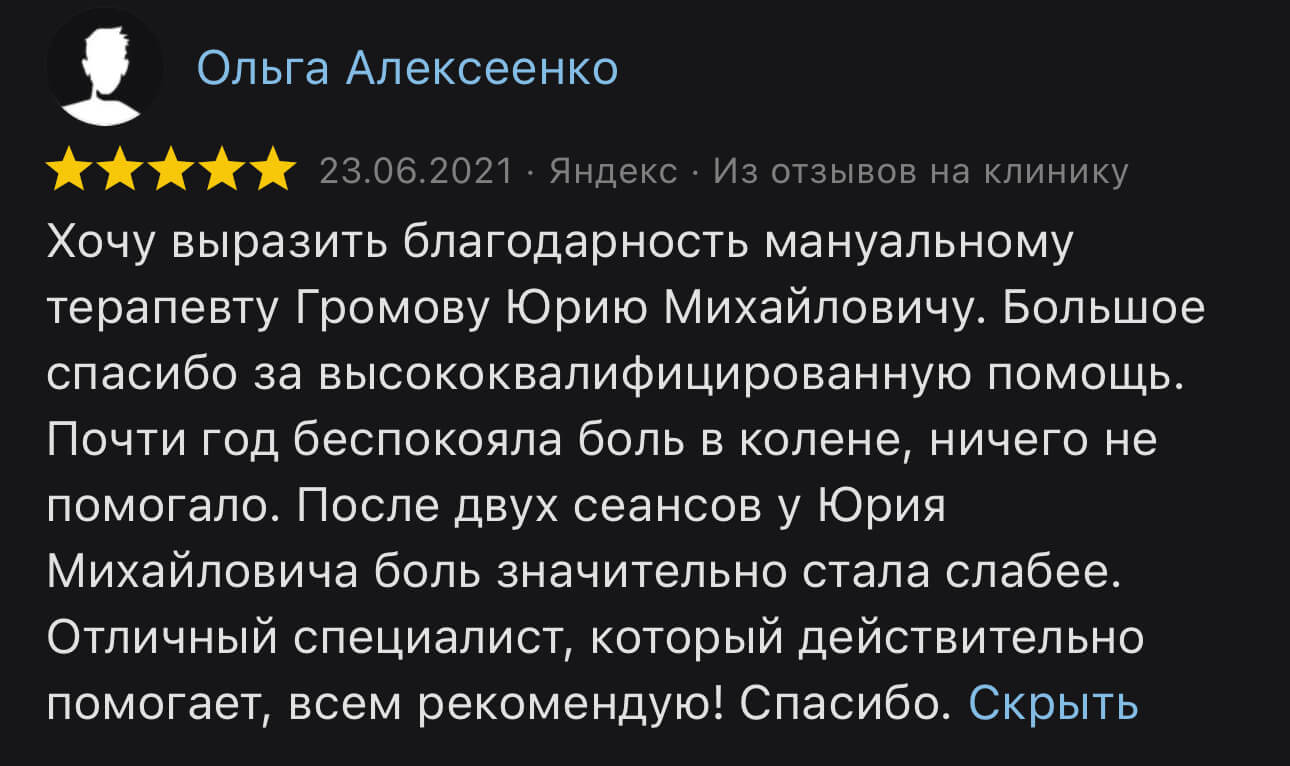 Один из распространённых мифов при положительной оценке сеанса звучит примерно так: «Он меня так закрутил, так всё хрустело, теперь точно всё на место встало». В реальности, болевые ощущения и даже мысленное ожидание болевых ощущений приводят к мышечному напряжению, а это мешает восстановлению правильного положения позвонков. Основным инструментом доктора в нашем центре являются умелые руки, да чуткие пальцы, воздействие которых должно быть мгновенным и точным.
