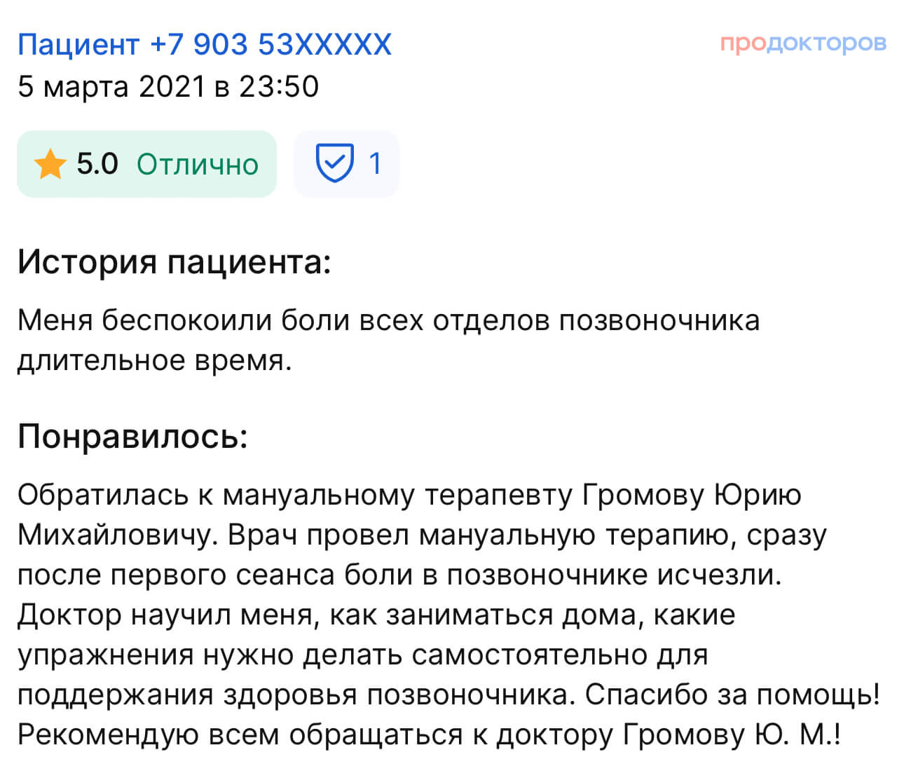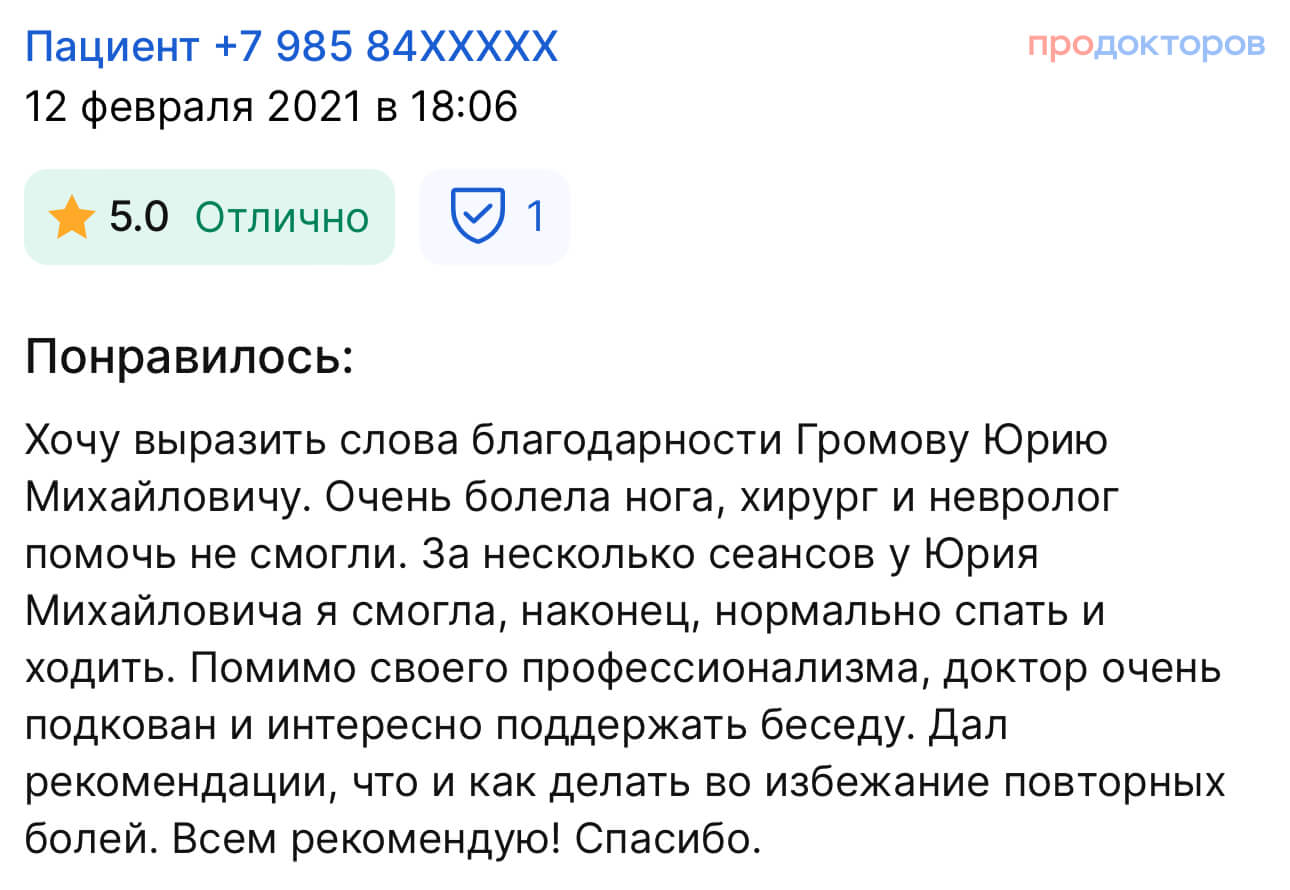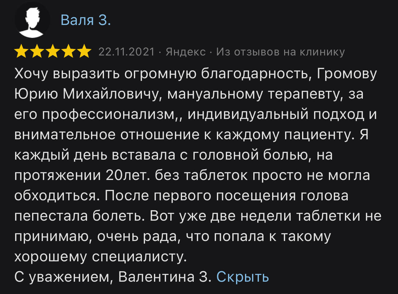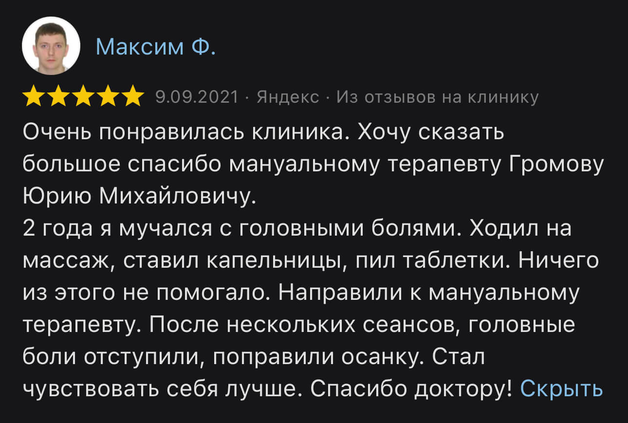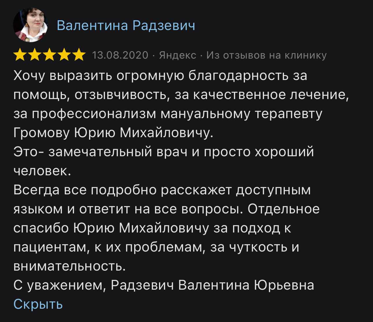 Один из распространённых мифов при положительной оценке сеанса звучит примерно так: «Он меня так закрутил, так всё хрустело, теперь точно всё на место встало». В реальности, болевые ощущения и даже мысленное ожидание болевых ощущений приводят к мышечному напряжению, а это мешает восстановлению правильного положения позвонков. Основным инструментом доктора в нашем центре являются умелые руки, да чуткие пальцы, воздействие которых должно быть мгновенным и точным.