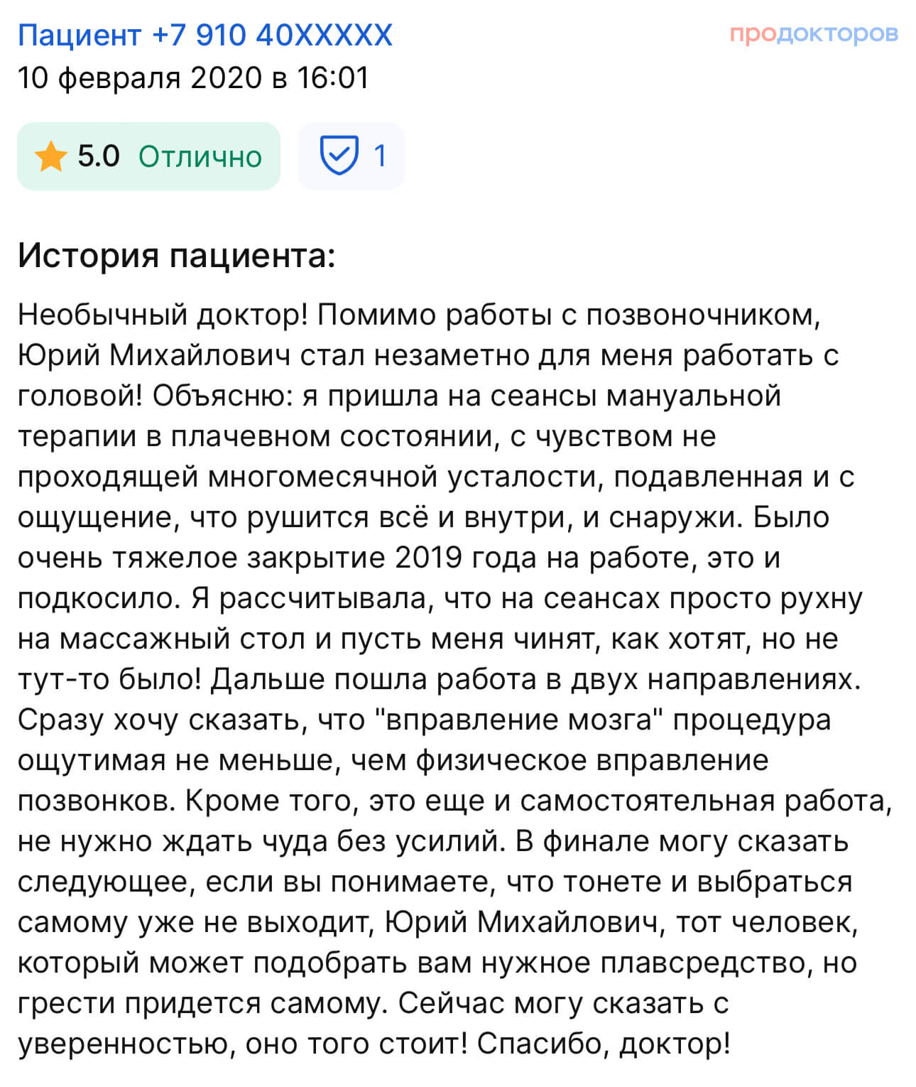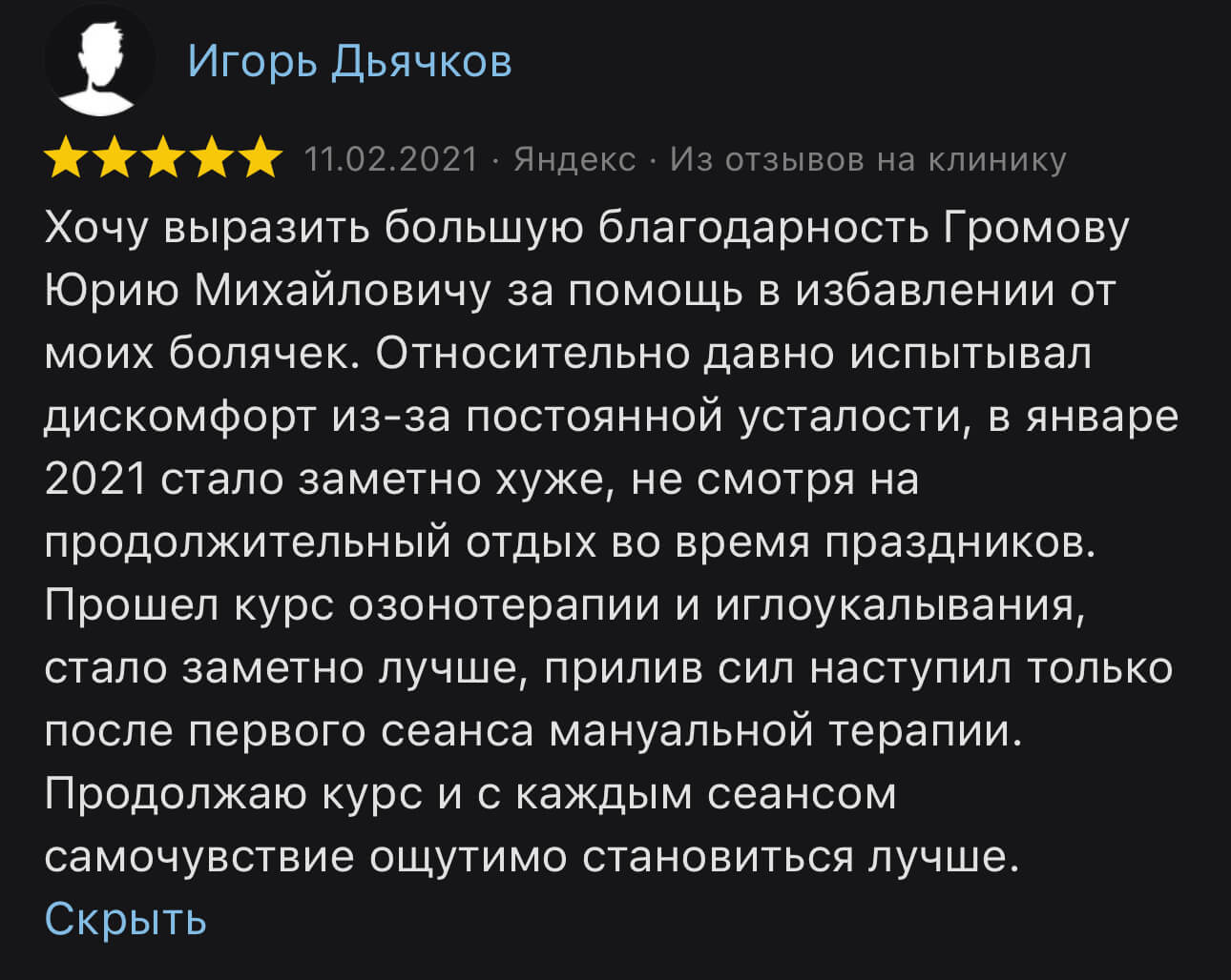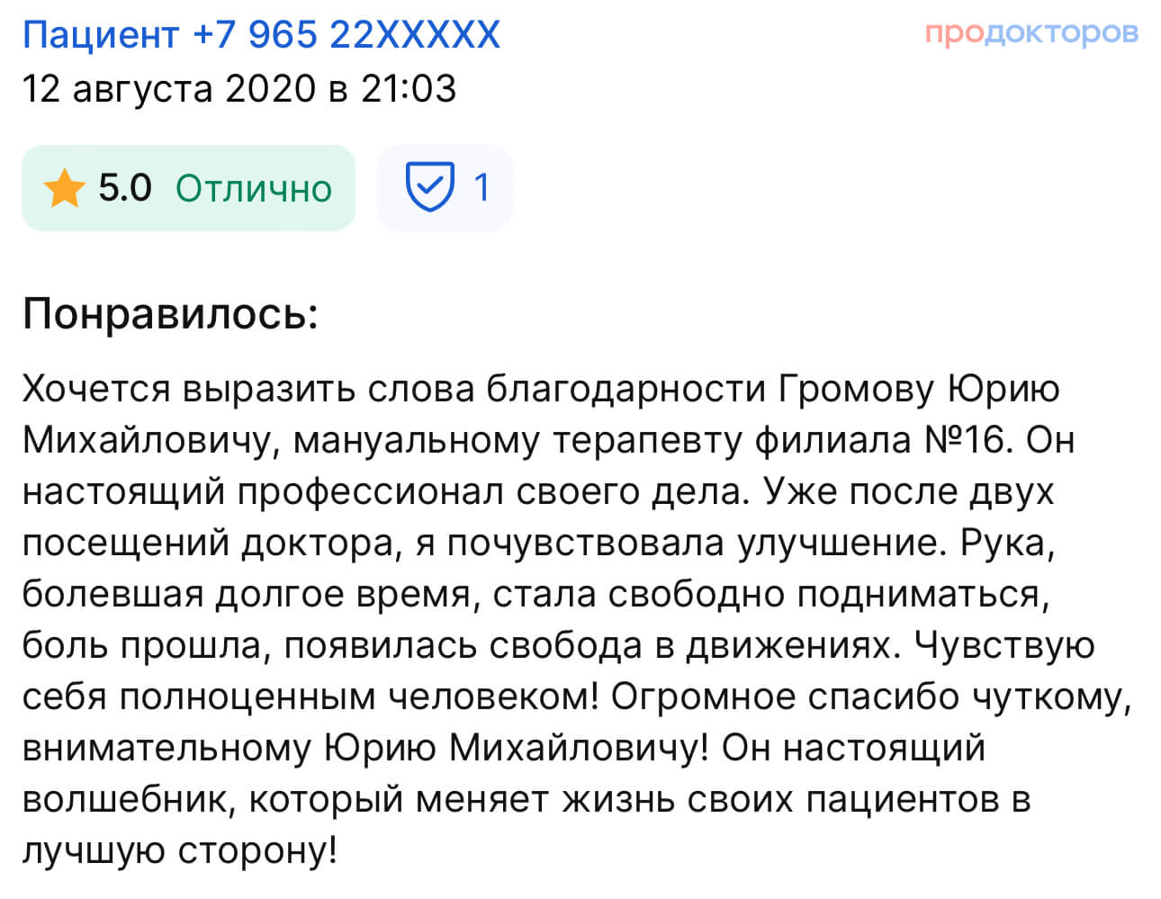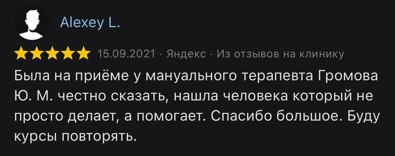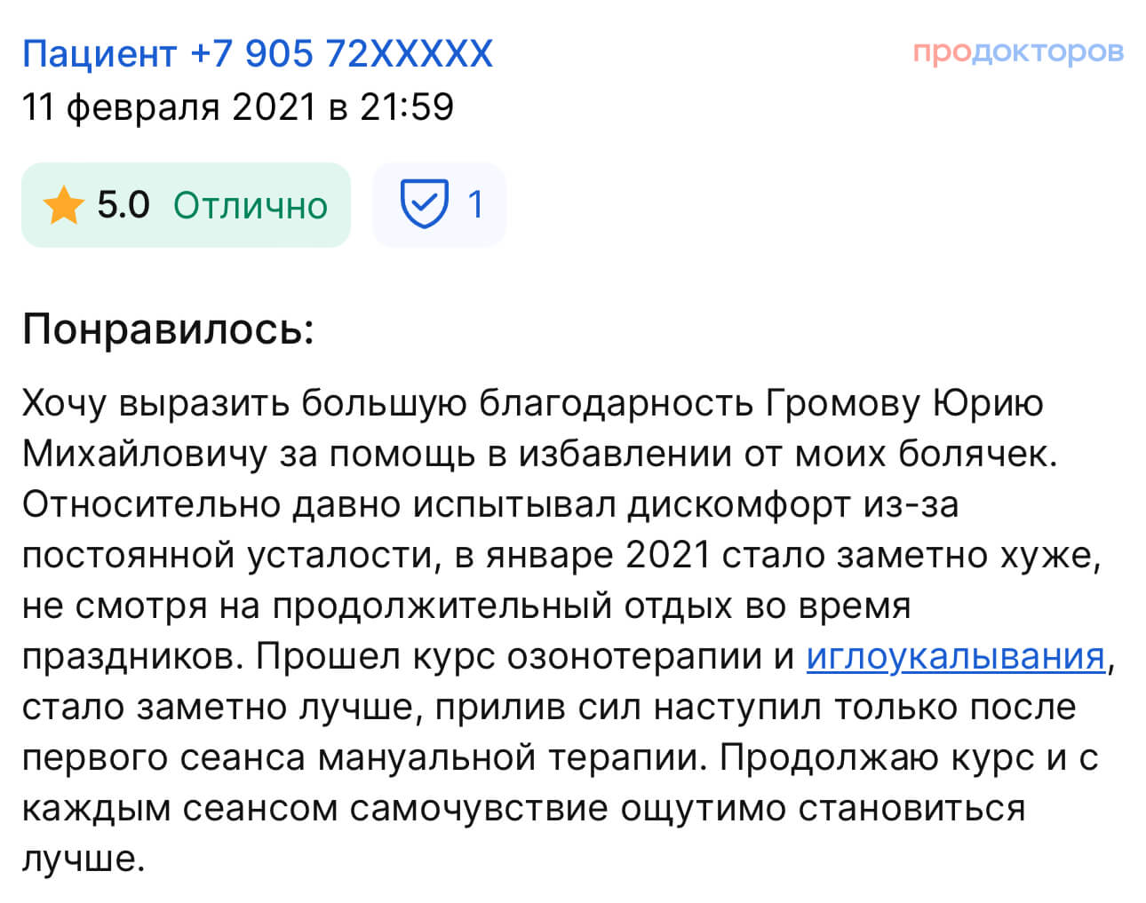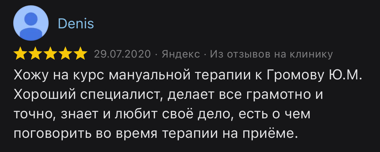 Один из распространённых мифов при положительной оценке сеанса звучит примерно так: «Он меня так закрутил, так всё хрустело, теперь точно всё на место встало». В реальности, болевые ощущения и даже мысленное ожидание болевых ощущений приводят к мышечному напряжению, а это мешает восстановлению правильного положения позвонков. Основным инструментом доктора в нашем центре являются умелые руки, да чуткие пальцы, воздействие которых должно быть мгновенным и точным.