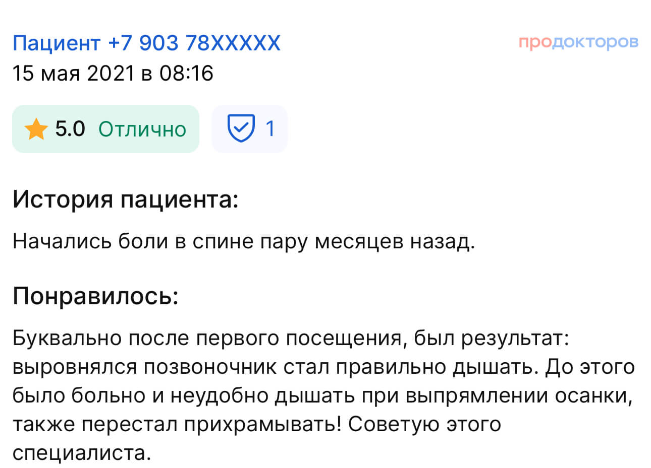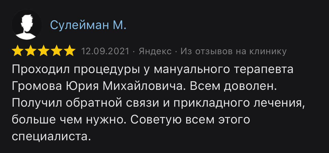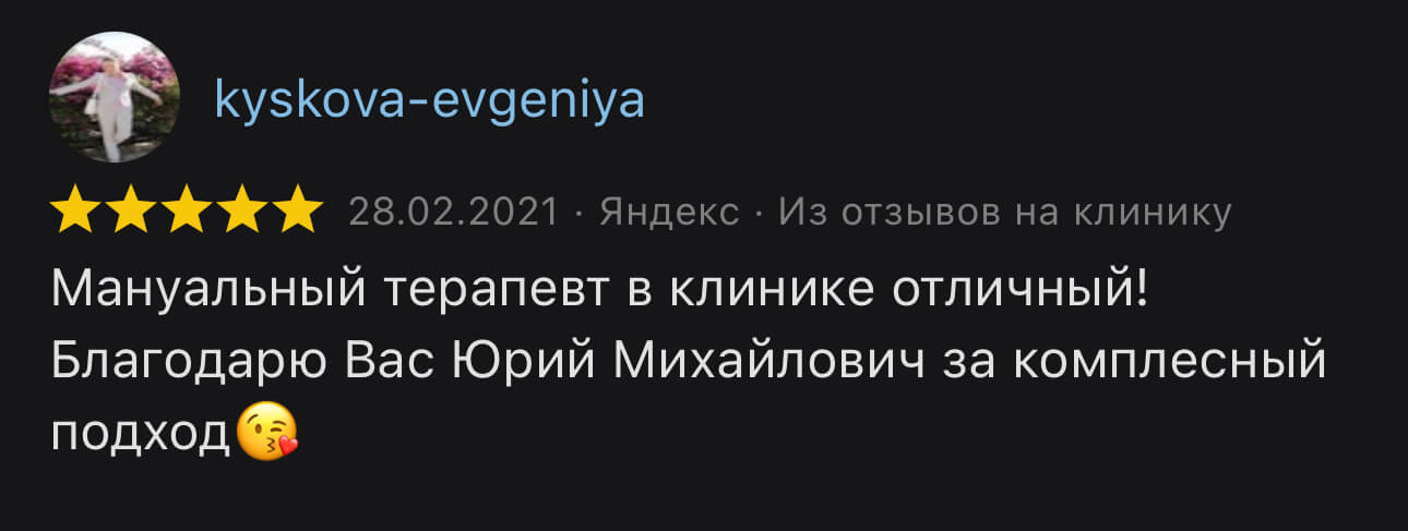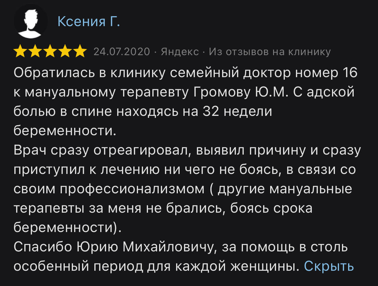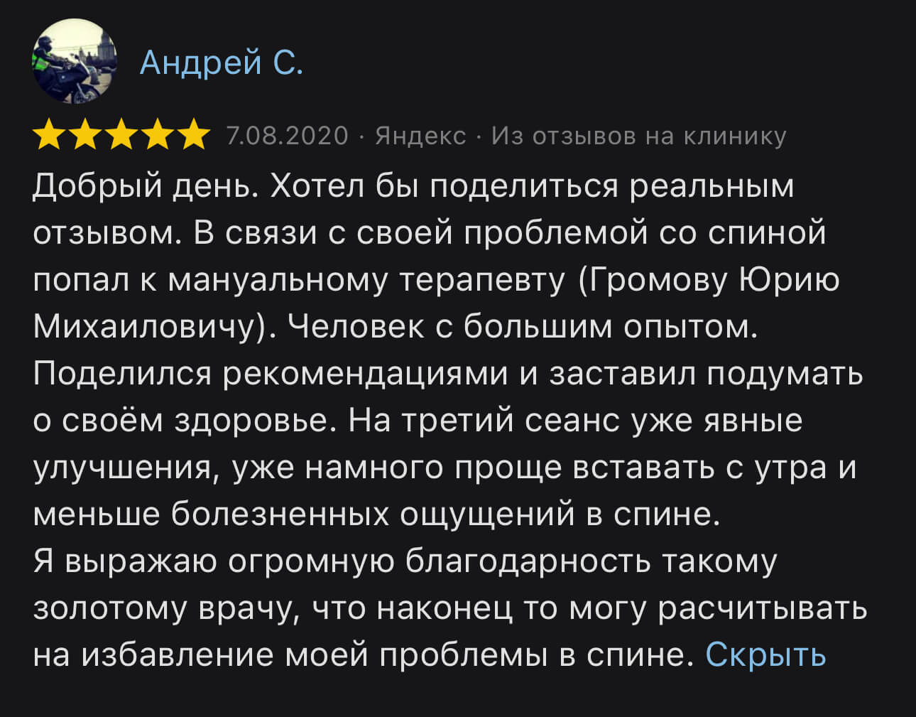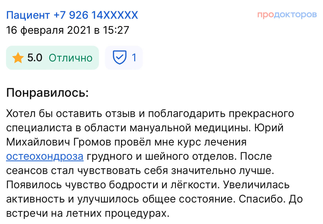 Один из распространённых мифов при положительной оценке сеанса звучит примерно так: «Он меня так закрутил, так всё хрустело, теперь точно всё на место встало». В реальности, болевые ощущения и даже мысленное ожидание болевых ощущений приводят к мышечному напряжению, а это мешает восстановлению правильного положения позвонков. Основным инструментом доктора в нашем центре являются умелые руки, да чуткие пальцы, воздействие которых должно быть мгновенным и точным.