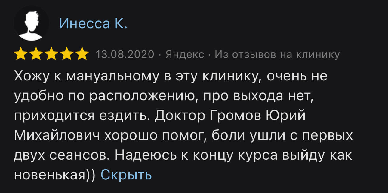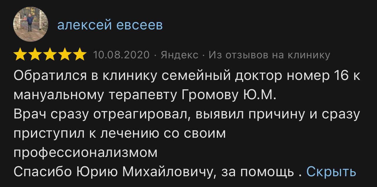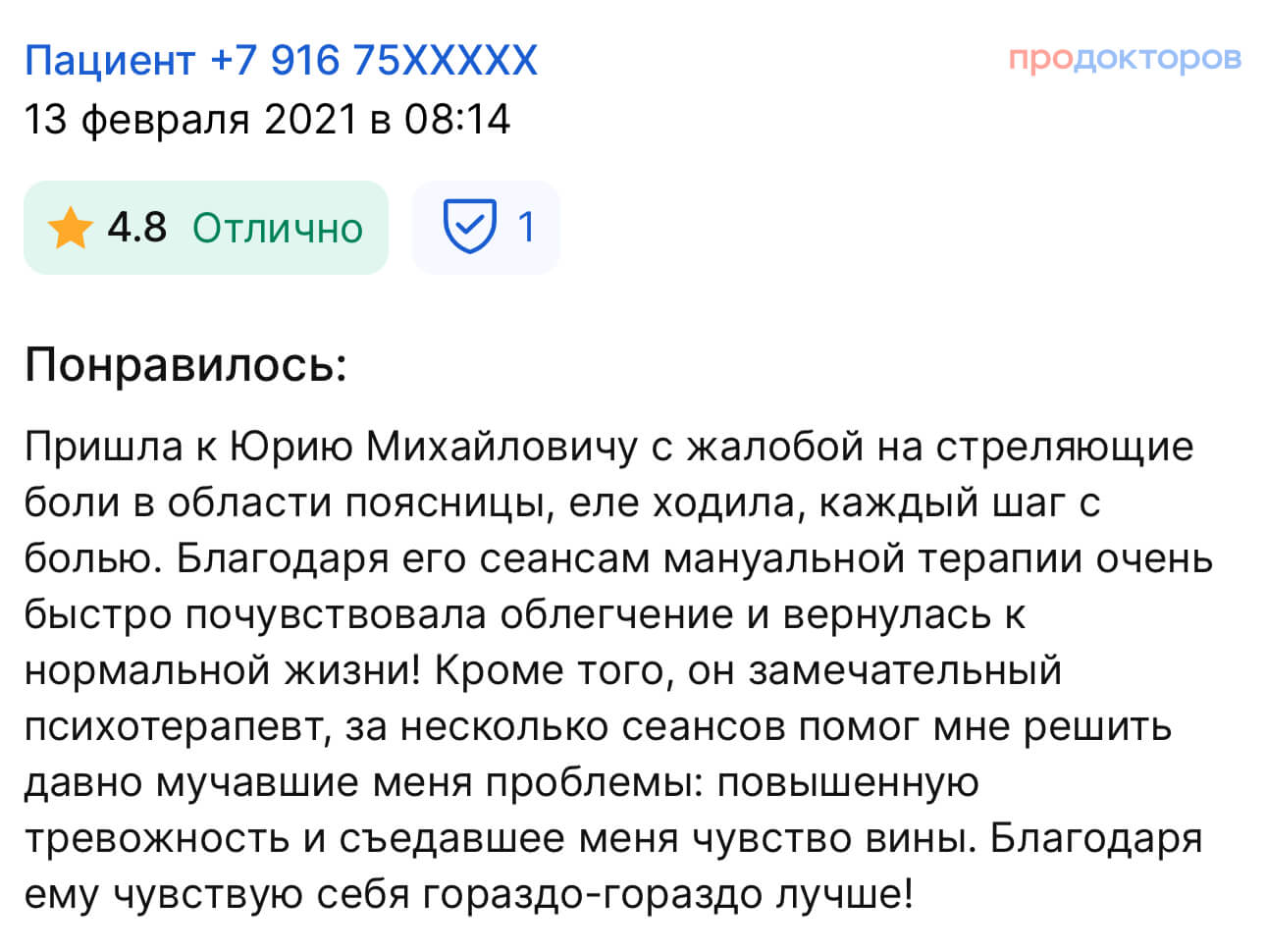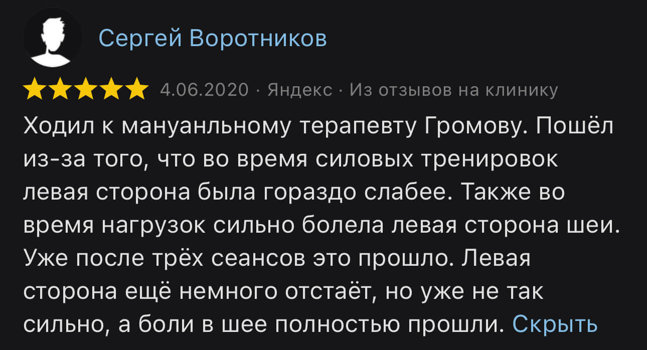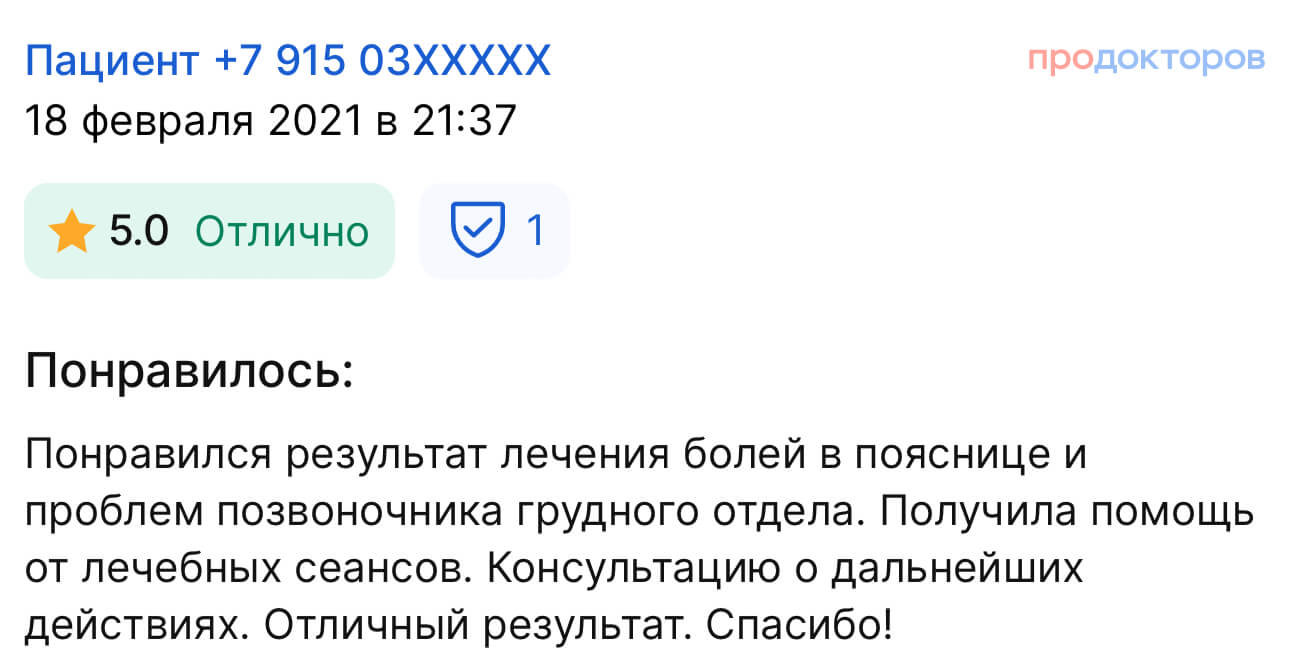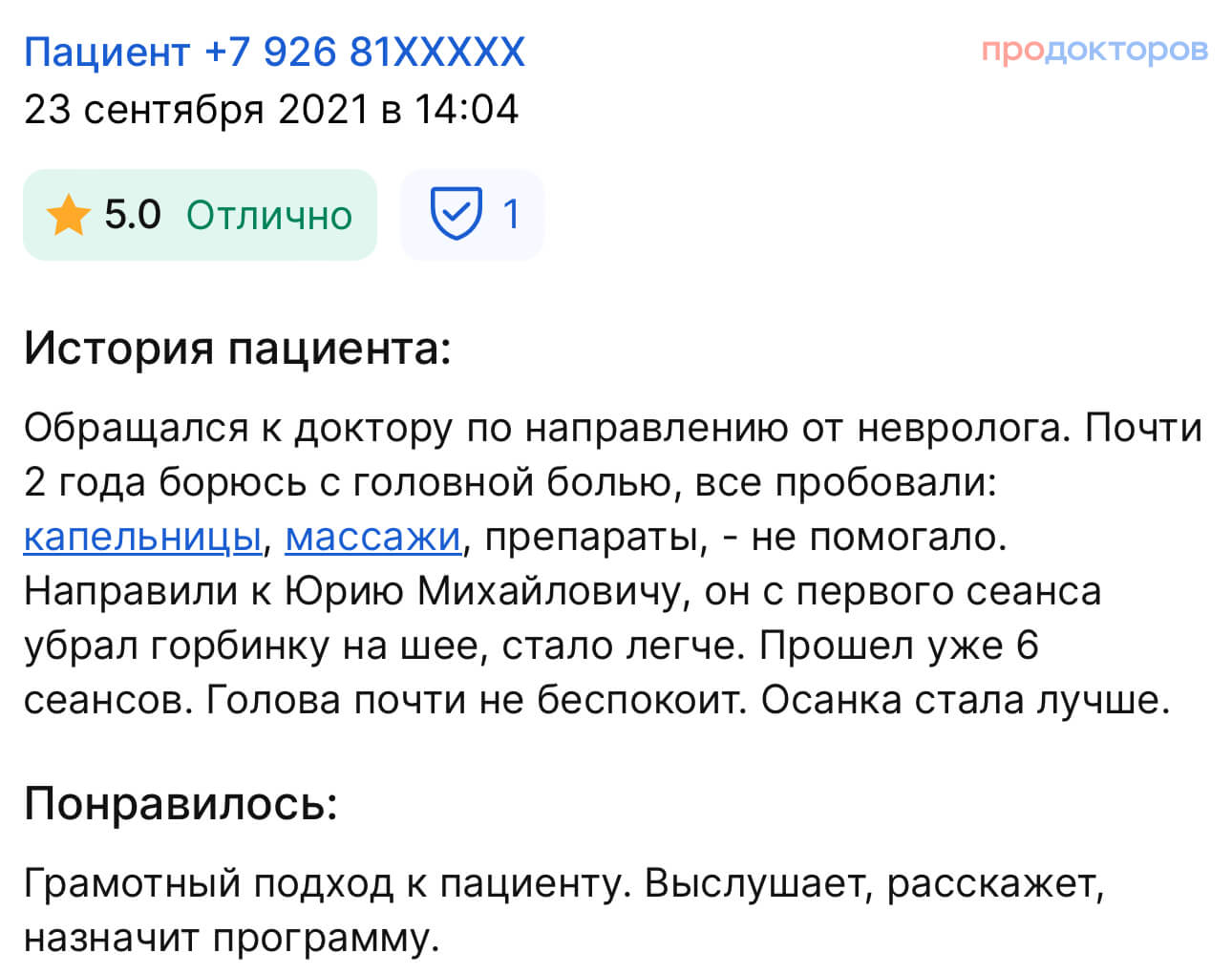 Один из распространённых мифов при положительной оценке сеанса звучит примерно так: «Он меня так закрутил, так всё хрустело, теперь точно всё на место встало». В реальности, болевые ощущения и даже мысленное ожидание болевых ощущений приводят к мышечному напряжению, а это мешает восстановлению правильного положения позвонков. Основным инструментом доктора в нашем центре являются умелые руки, да чуткие пальцы, воздействие которых должно быть мгновенным и точным.
