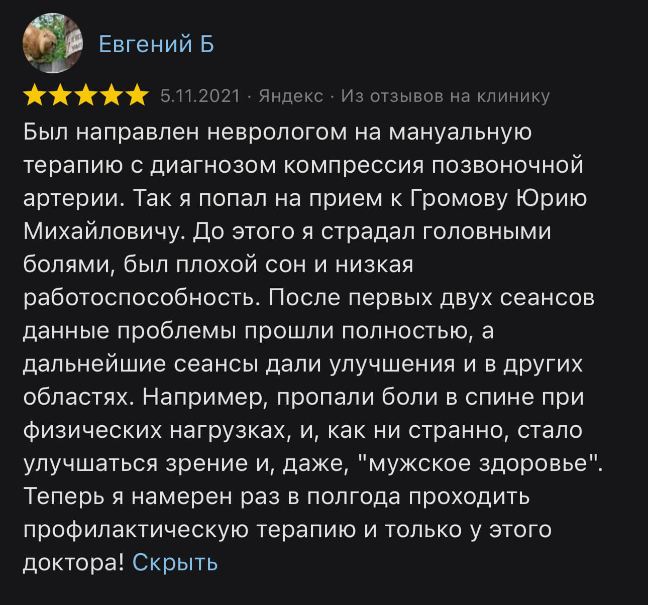 После манипуляции на шейном отделе, пациент сразу отмечает «яркий» эффект — ясность в голове, устранение головной боли, улучшение зрения.